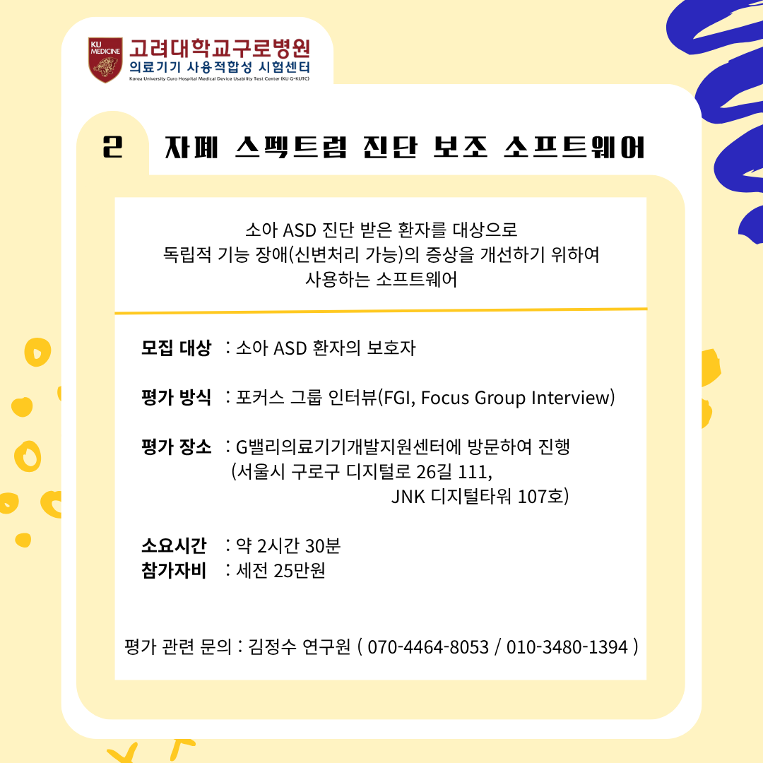 안녕하십니까? 고려대학교 구로병원 의료기기 사용적합성 시험센터 김정수 연구원입니다. 저희 센터에서는 소아 자폐스펙트럼장애 (Autism Spectrum Disorder. ASD)를 가진 아동의 신변처리 기술(배변 활동)을 개선하는 목적으로 개발 중인 소프트웨어 의료기기의 사용적합성 테스트 참가자를 모집하고 있습니다. 현재 제품 개발이 완료되지 않아, 소아 ASD 환자의 보호자를 대상으로 먼저 의견을 청취하고 제품을 개선한 후 최종적으로 소아 ASD 환자를 대상으로 테스트를 진행할 예정입니다. 따라서 이번 테스트는 소아 ASD 환자의 보호자를 대상으로 진행되며, 개발된 제품을 직접 사용해보신 후 진행자와 함께 제품 개선점에 대한 의견을 나누는 포커스 그룹 인터뷰(FGI) 방식으로 진행됩니다. 소요시간은 약 2시간 30분 예상되며, 사례비는 25만원(세전) 지급해 드립니다. 사용적합성 테스트는 소아 자폐스펙트럼장애 신변처리 기술(배변 활동) 개선 의료기기의 제품 허가와 사용자(환자) 중심 제품 설계에 있어 매우 중요한 과정이기에, 귀 카페 운영진분들께 자폐스펙트럼장애 보호자 모집 협조 혹은 게시글을 올려도 되는지 승인 요청드리고자 카페에 가입하였습니다. 긍정적인 검토를 부탁드리며, 카페에서 가능한 범위 내에서 협조해주시면 진심으로 감사하겠습니다. >※ 평가 관련 문의: 김정수 연구원 (070-4464-8053 / 010-3480-1394) *의료기기 사용적합성 테스트는 의료기기를 개발하는 과정에서 실 수요자를 대상으로 제품을 안전하게 사용할 수 있는지 확인하고, 개선점 탐색을 통해 안전하고 효과적인 제품이 개발 될 수 있도록 제품 개발 과정입니다. [테스트 개요] - 평가 제품: 소아 ASD 배변 활동 기능 개선 소프트웨어 의료기기(2등급 자폐 스펙트럼 진단 보조 소프트웨어 의료기기) - 의뢰사: (주)이모티브 - 일시: 2025년 11월 3일(월) ~ 2025년 11월 28일(금) 중 1회 참여 - 장소: G밸리의료기기개발지원센터(지하철 2호선 구로디지털단지역 인근) - 테스트 방식: 포커스 그룹 인터뷰(FGI, Focus Group Interview) - 모집대상: 소아 ASD 환자의 보호자 - 소요시간: 2시간 30분 - 사례비: 25만원(세전) |