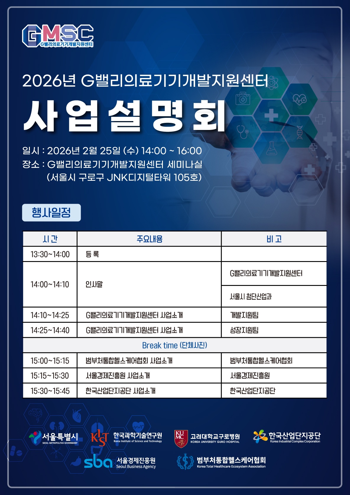 2026년 2월 25일 수요일 G밸리의료기기개발지원센터 세미나실에서 사업설명회를 개최합니다.